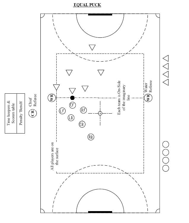 The forward's job when the other team has the puck is to backpick the other's teams curls and to stop the puck from swinging from one side of the pool to the other. The weakside forward's job is to intercept any passes that swing into their area, and either drive the puck back to the wall (safest) or drive to the other team's goal (risky, but can be very effective if the other team is out of position trying to score).