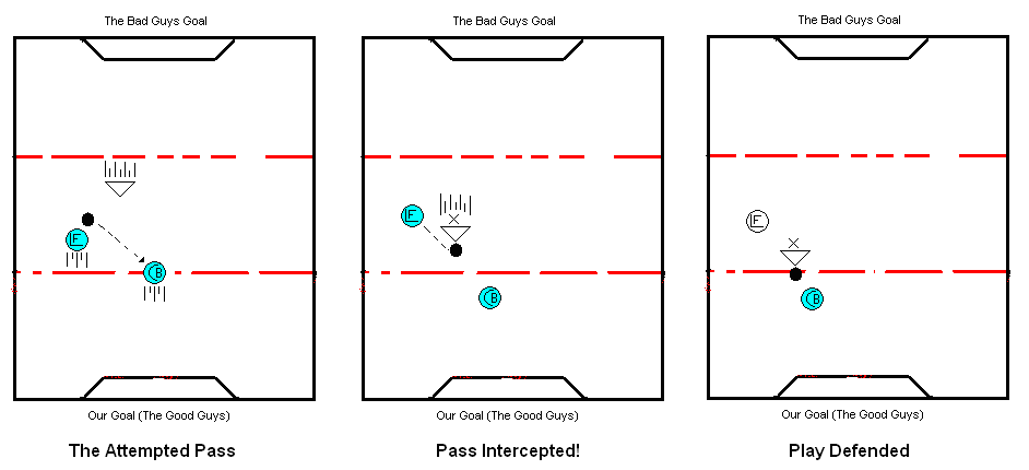 In this example a forward is passing to their back, but good positioning while passing is vital for any pass between players. The illustration below is an example of bad passing.