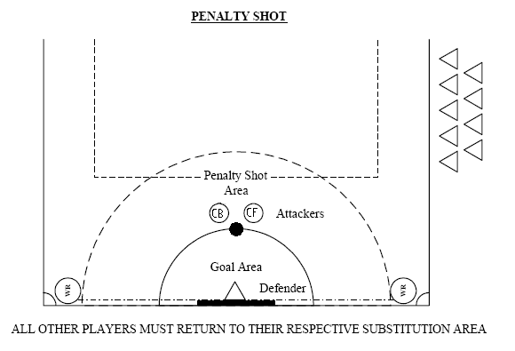 Should any infringement occur within the 3 meter goal area that prevents an almost certain goal, a penalty shot is awarded.